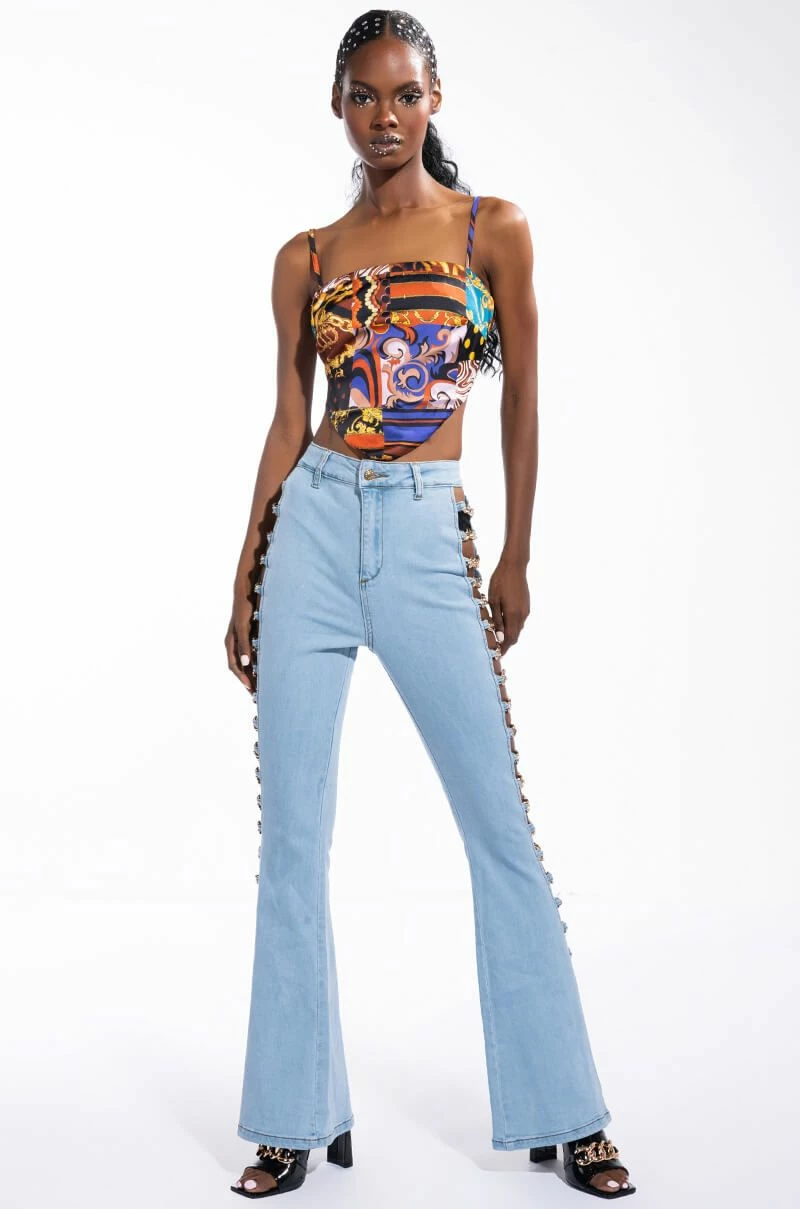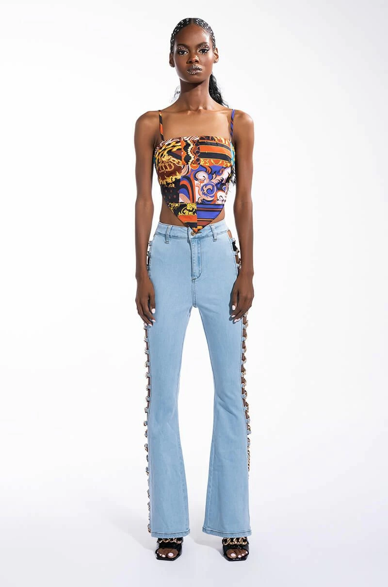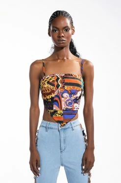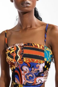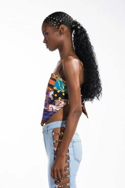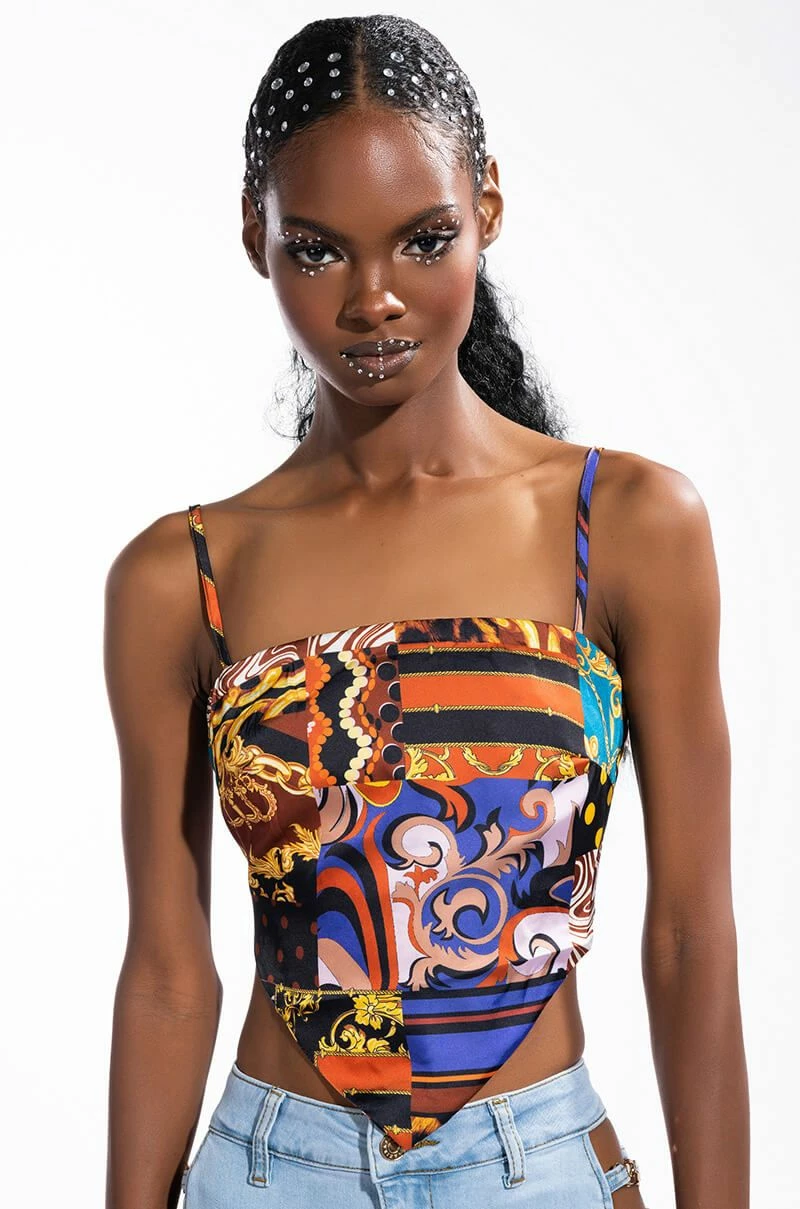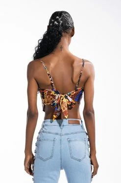 The AKIRA Label Summer Love Scarf Tie Back Blouse features a soft satin fabrication, adjustable spaghetti straps, a straight across neckline, and all over baroque print patterning. Complete with a tie back design, a pointed hem, and a cropped cut. Style it with white jeans and kitten heels for your next happy hour date!