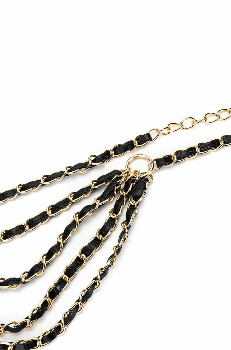The AKIRA Label Supermodel Chain Link Belt features a faux gold chain link base, a faux leather ribbon belt construction, draped chain link accents, and an adjustable lobster claw clasp.