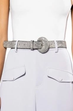 The AKIRA Label Supernova Belt is a vegan leather waist belt featuring all-over rhinestone detailing, an oval-shaped buckles, and a pin buckle closure.