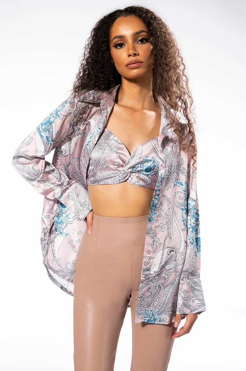 The AKIRA Label Sure Thing Twisted Front Bralette is made from a slick satin fabrication and features an artsy paisley print, adjustable spaghetti straps, a plunging cross front neckline with twist front detail, a cropped silhouette, and a thin ruched elastic back band. Pair this piece with the matching AKIRA Label Sure Thing Button Up Blouse and straight leg jeans to complete your look.