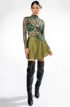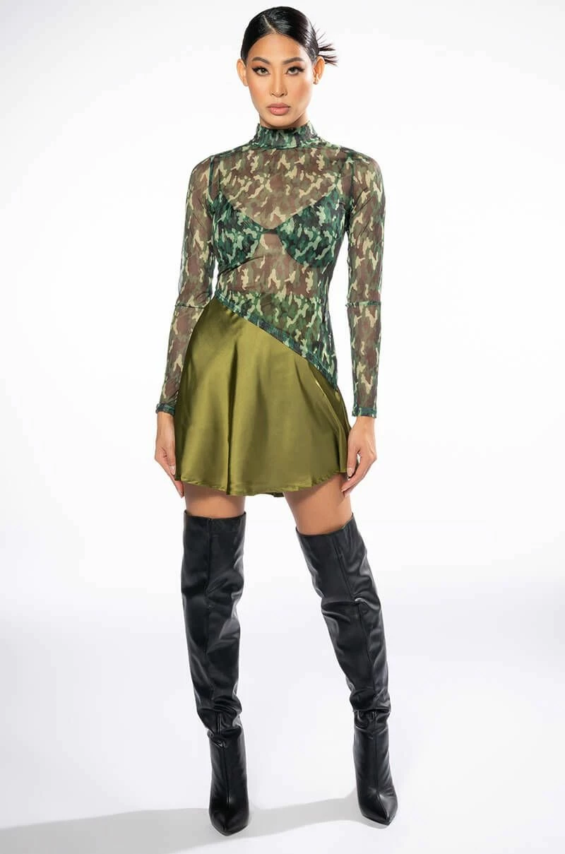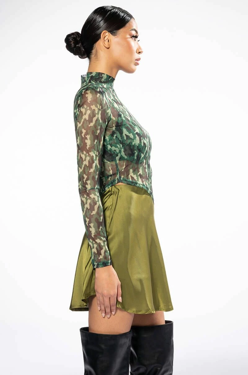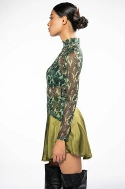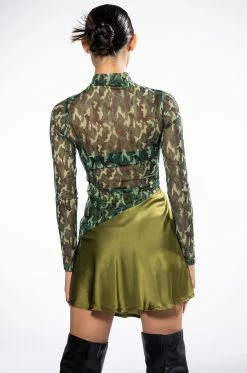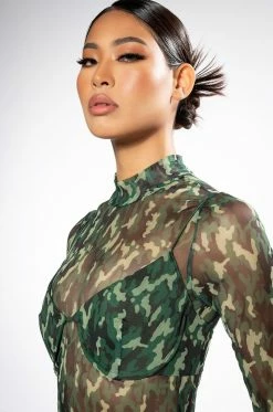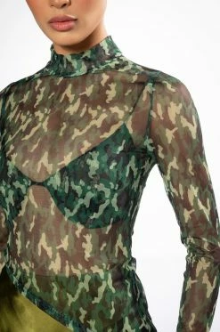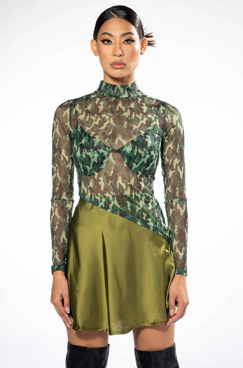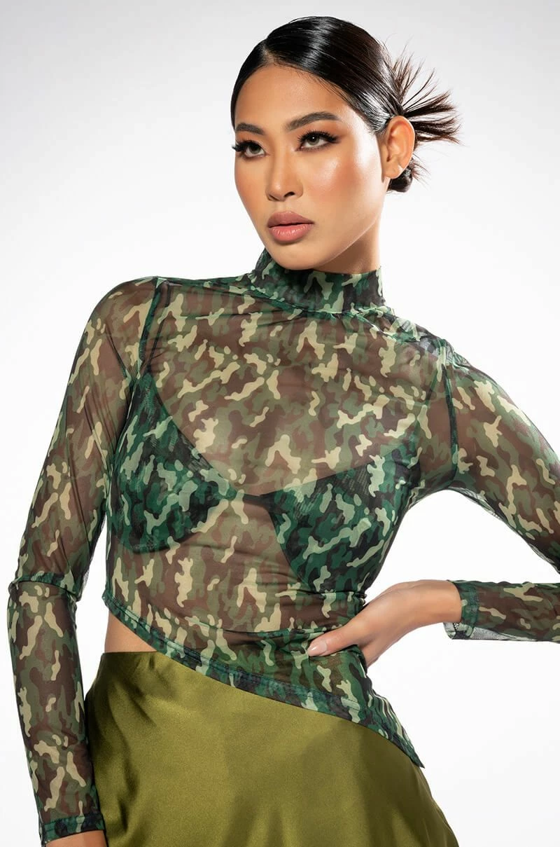 The AKIRA Label Survivor Mesh Camo Bra And Long Sleeve Top Set includes a sexy, sheer crop top with a high mock neckline, an asymmetrical cropped cut, and camo print patterning. Complete with a separate padded bra featuring underwire for structure, elastic spaghetti straps, and hook and eye back zipper closures. Try pairing this sultry set with low key cargo pants and pointy toe pumps.
