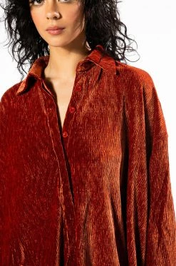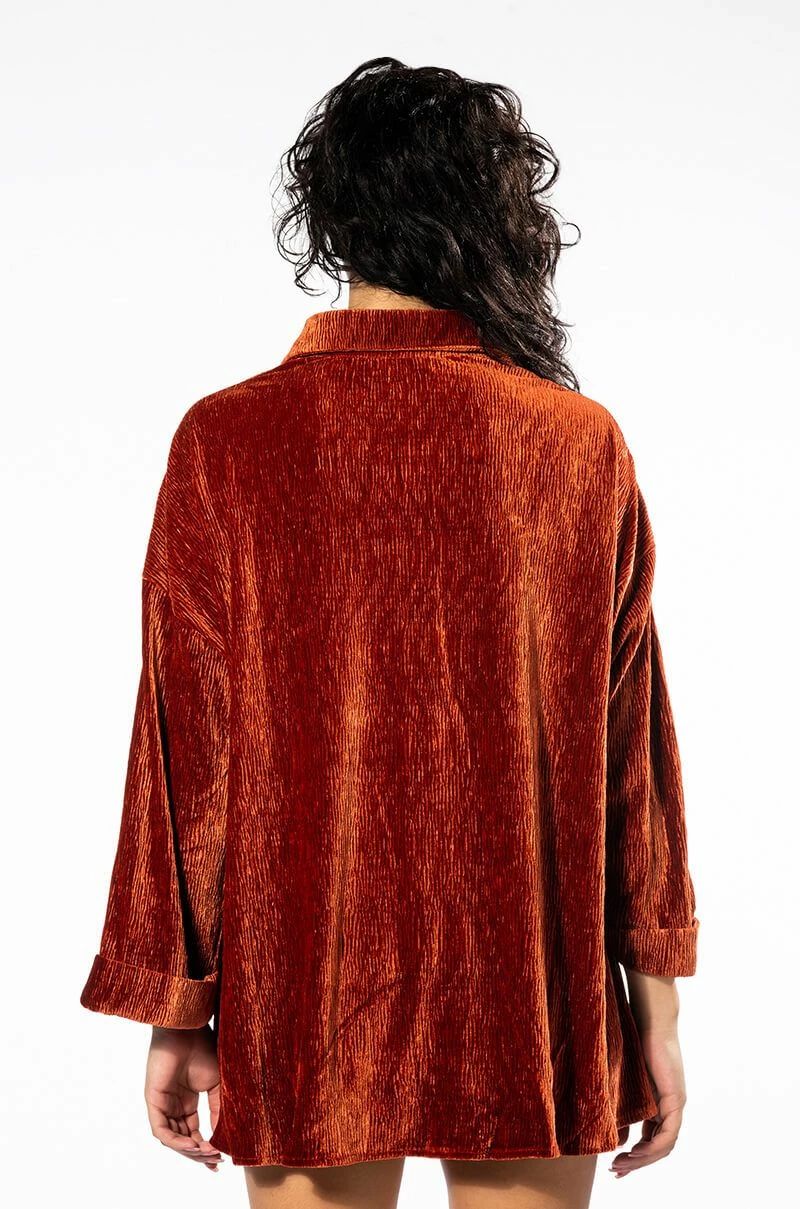 Talk flirty to me. The AKIRA Label Sweet Talk Button Up features a textured velvet fabrication, a collared neckline, long cuffed sleeves, side slit detailing, and a button up front closure. Complete with an oversized silhouette. Pair this piece with the matching AKIRA Label Sweet Talk Shorts to complete your look!