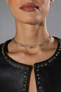 We donβt play around with The AKIRA Label Take Caution Rhinestone Paperclip Choker! This edgy necklace features a faux silver metal base, a rhinestone embellished paperclip chain link design, a choker necklace silhouette, and a lobster claw chain closure.