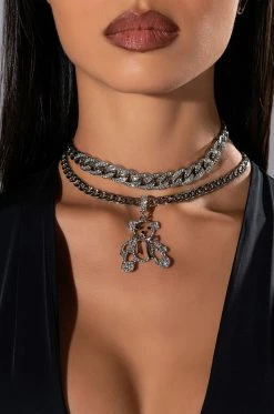The AKIRA Label Teddy Layered Rhinestone Choker is made from a faux silver metal base and features two curb chain link necklaces: a thick curb chain link with pave rhinestone detailing and a thinner curb chain link with a pave rhinestone open teddy bear pendant. Both necklaces are complete with adjustable lobster claw closures. Style them together for all of the cutesy chic bling!