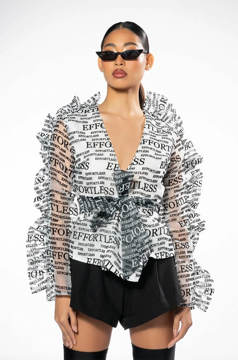 The AKIRA Label That New News Ruffle Long Sleeve Blouse features a lined chiffon fabrication, a plunging neckline, long ruffle trim blouson sleeves, and a self-tie waist belt. Complete with “Effortless,” velvet burnout text print patterning, a cinched waistline, and a waist length silhouette. Style with distressed denim, and sleek ankle booties for a complete look.