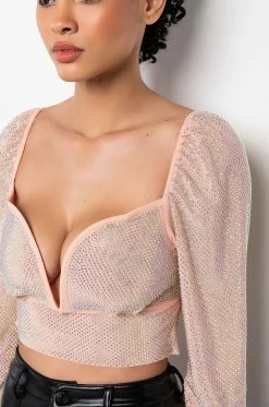 The AKIRA Label The Show Goes On Rhinestone Mesh Long Sleeve Blouse is made from a layered mesh fabrication, and is complete rhinestone embellishing, a cropped length, a low cut wired neckline, puffed shoulder long sleeves, a tie back closure, and a zipper back closure.