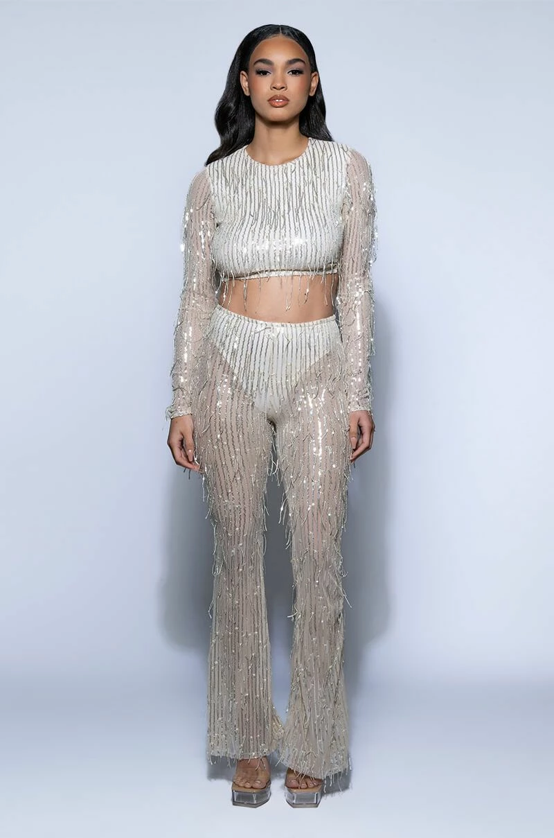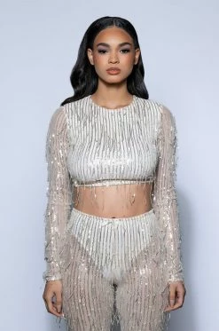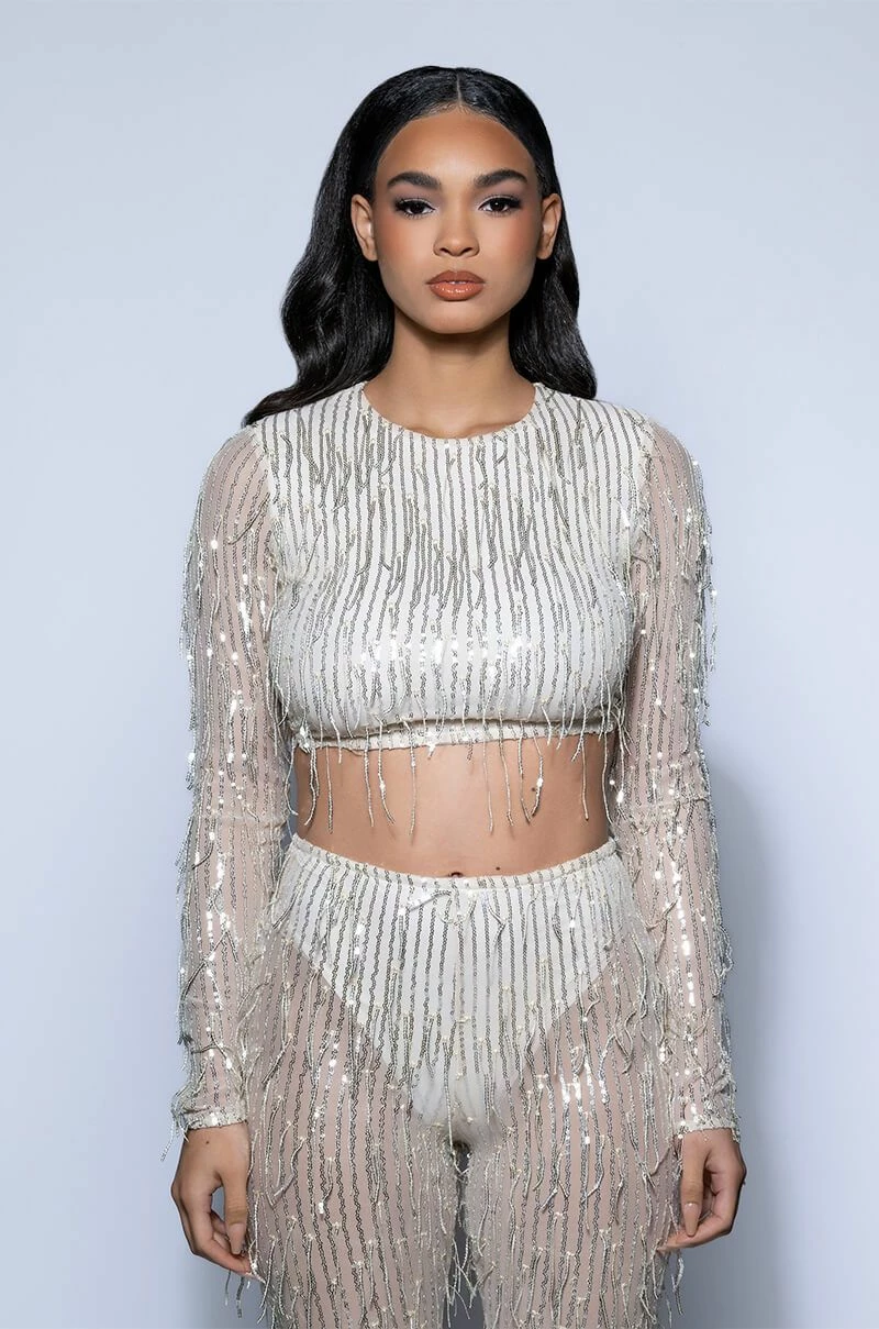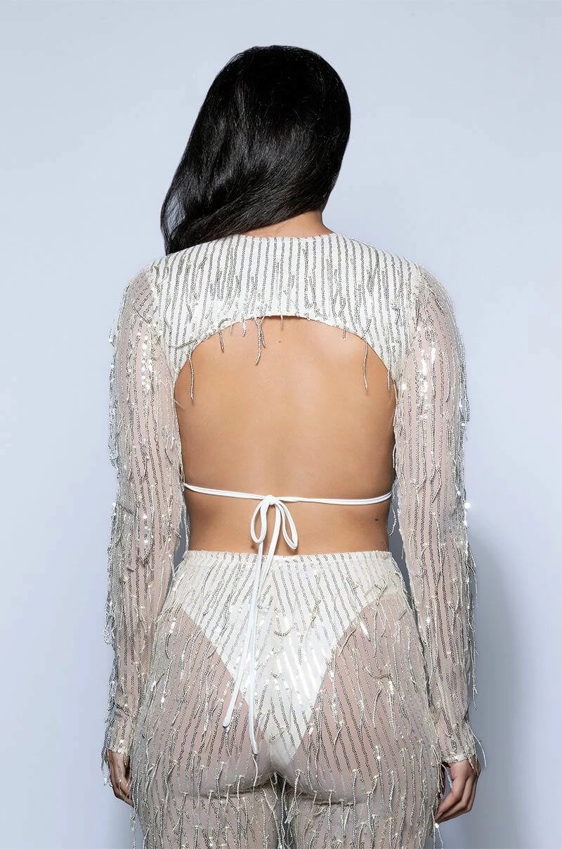 Steal the show with The AKIRA Label Tonight Is The Night Sequin Long Sleeve Top In Champagne! This mesmerizing cropped top is made from a sheer, mesh fabrication and an allover iridescent sequin fringe design. Complete with an open back, tie back details, a crew neck, long sleeves, a soft inner lining, and a rounded hem. Pair with the coordinating matching bottom, The AKIRA Label Popping Bottles Tonight Sequin Pants, and pumps for a finished look!