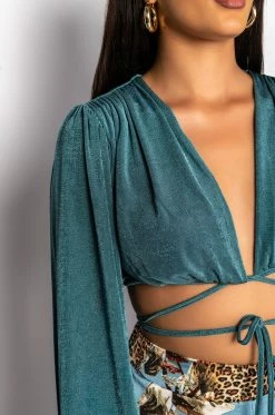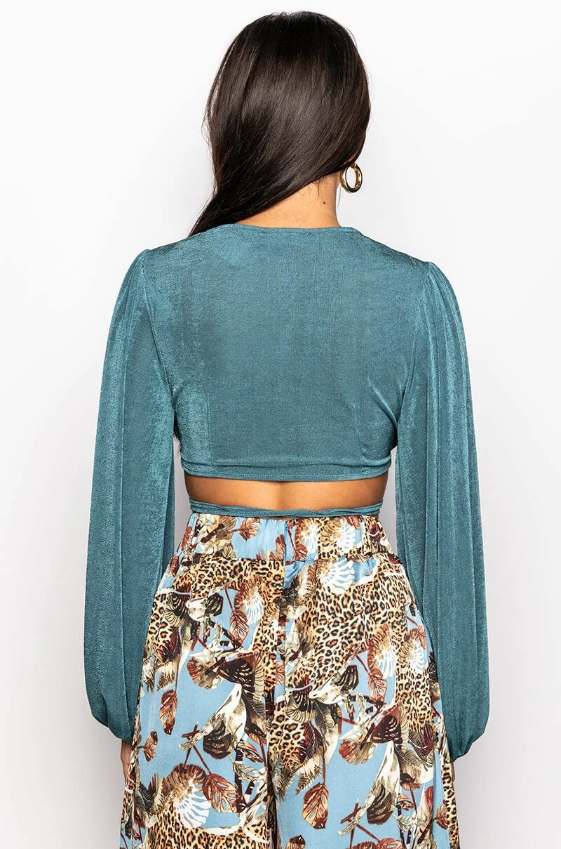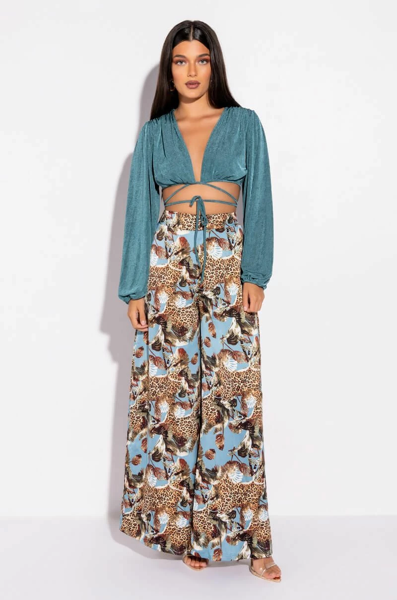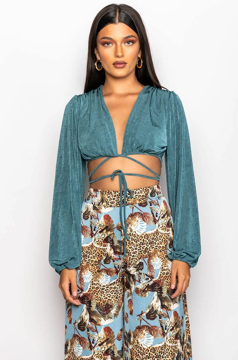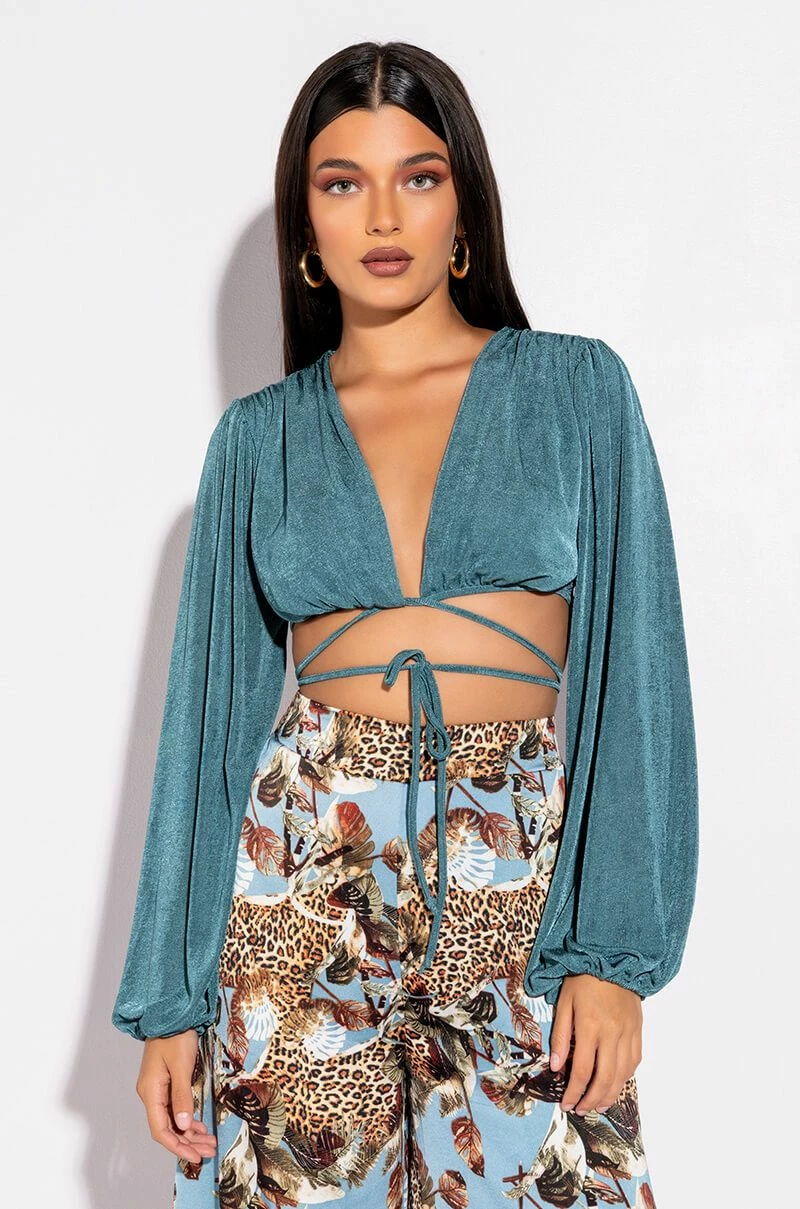 The AKIRA Label Try Harder Tie Front Crop Top is made from a stretchy, lightweight fabrication and features a plunging neckline, long blouson sleeves, a thin elastic hem, cropped silhouette, and a tie front closure. Pair this piece with the matching AKIRA Label Try Harder Wide Leg Legging to finish off your flowy, whimsical look!
