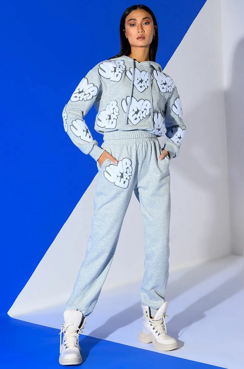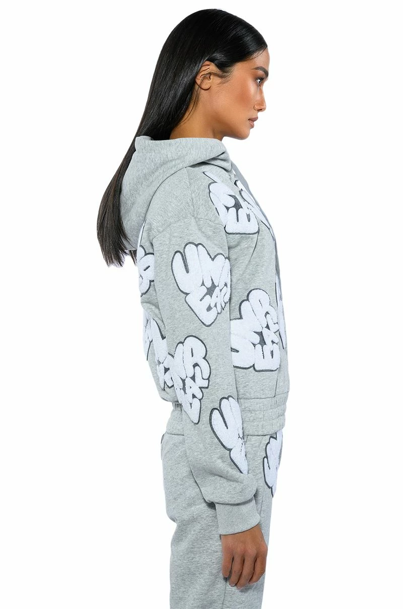 The AKIRA Label Unreal Hoodie With Patches is made from a cozy sweatshirt fabrication and features a drawstring hood, long sleeves with ribbed elastic wrists, and a shirred elastic hem. Complete with scattered “Unreal” fuzzy text patch detailing. Pair this piece with the matching AKIRA Label Unreal Jogger With Patches to finish off your graphic athleisure look.