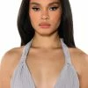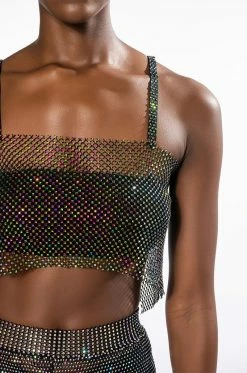 The AKIRA Label Vanessa Rhinestone Mesh Bralette is made from a sheer netted mesh base and features iridescent square rhinestone detailing, a square neckline, adjustable tank straps, an open back, and a cropped silhouette. Complete with an adjustable lobster claw chain link closure.