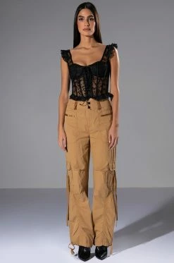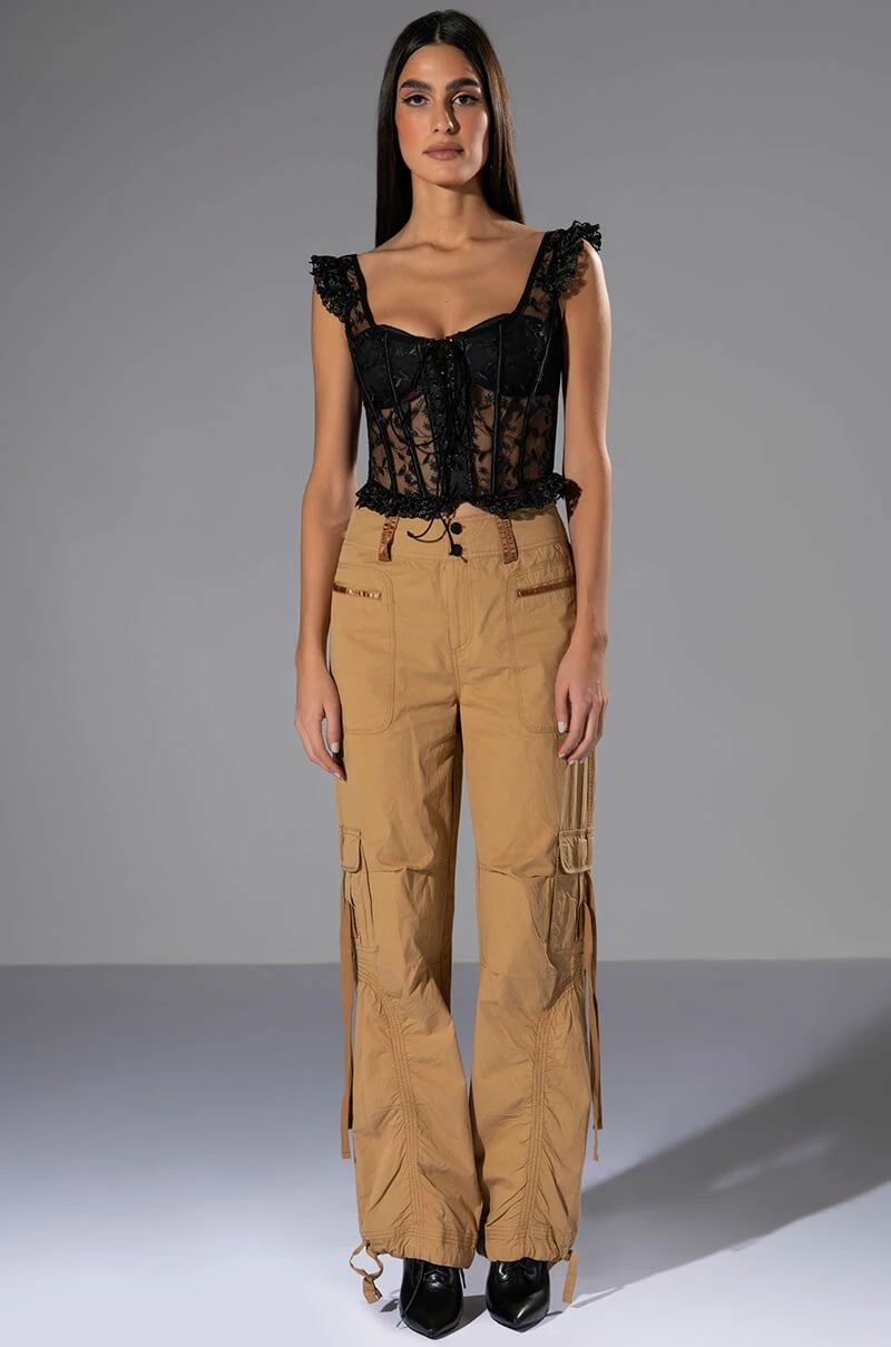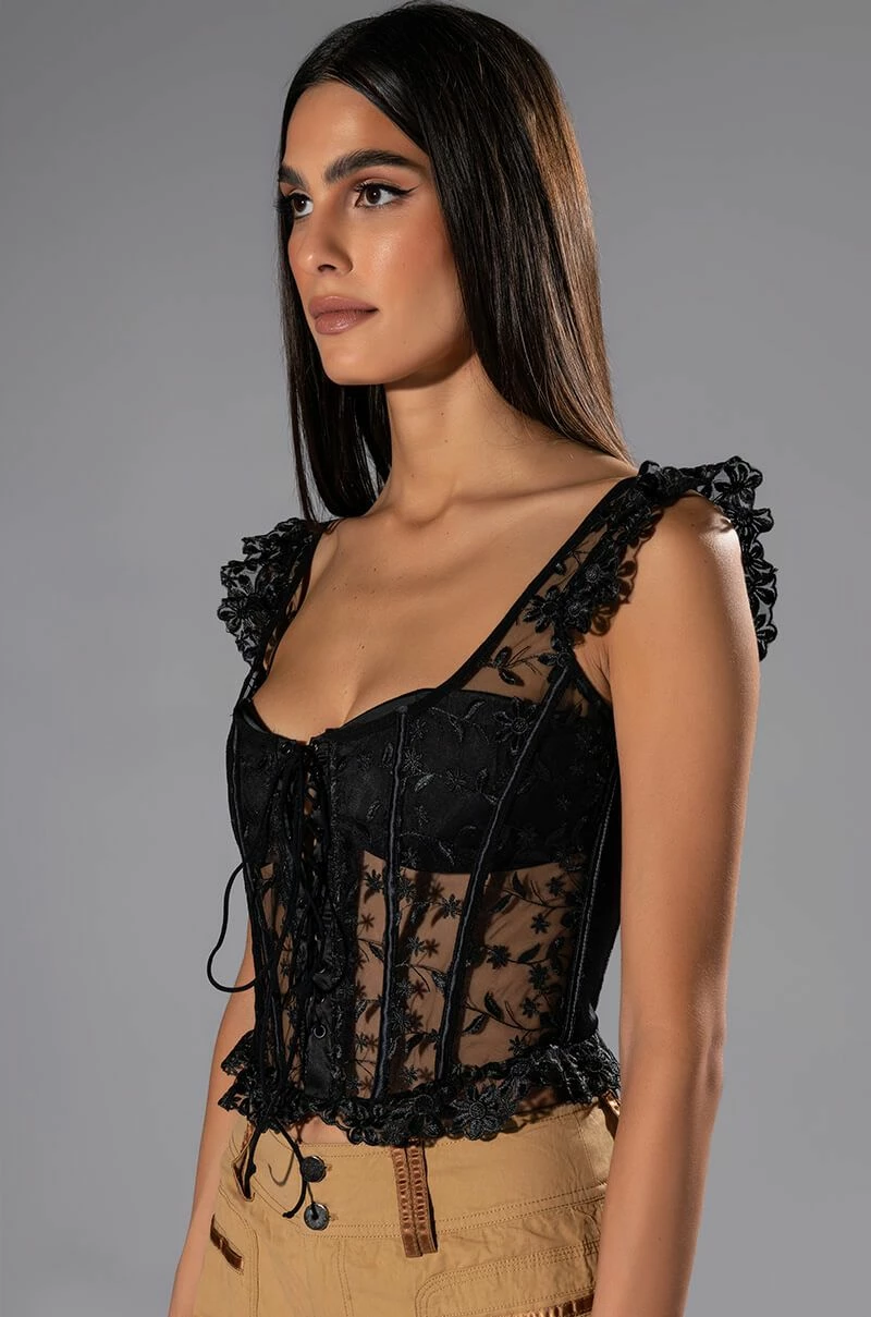 Come and get it, The AKIRA Label Ven Aqui Lace Up Corset Top has arrived! This sexy cropped number is made from a mesh base fabrication and features a beautiful all over embroidered floral design. Complete with ruffled embroidered tank straps, a scoop neckline, a lace up front enclosure, lightly padded cups, boning for structure, and a delicate lightly ruffled hem. Pair with your fave denim and stiletto pumps for a hot date night look.
