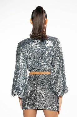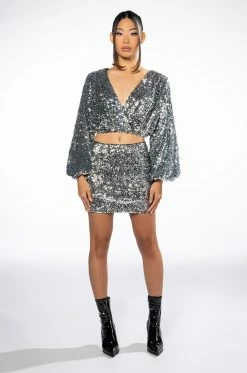 The AKIRA Label Viva Las Vegas Long Sleeve Cropped Wrap Blouse is a sequin-embellished cropped blouse featuring a mesh base, a deep v neckline, long blouson sleeves, a smooth inner lining, and an elastic hem. Style this top with The AKIRA Label Viva Las Vegas Mini Skirt and strappy sandals to complete your look.