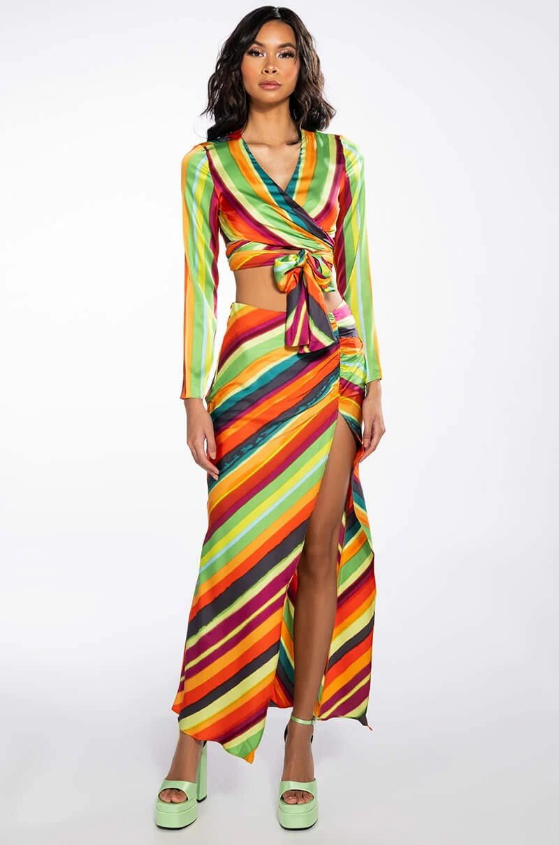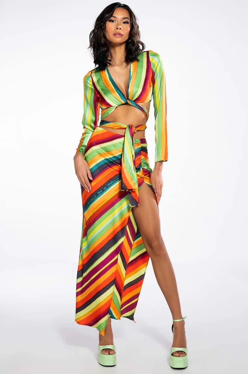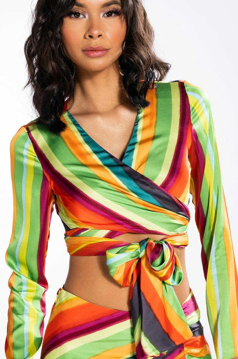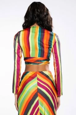The AKIRA Label Want You To Want Me Tie Front Blouse is made from a satin fabrication and features a multicolor striped pattern, a plunging neckline, long sleeves, a cropped silhouette, and a tie front closure. Pair this bold piece with the matching AKIRA Label Want You To Want Me Midi Skirt With High Slit and platform sandals to finish off your vibrant look.