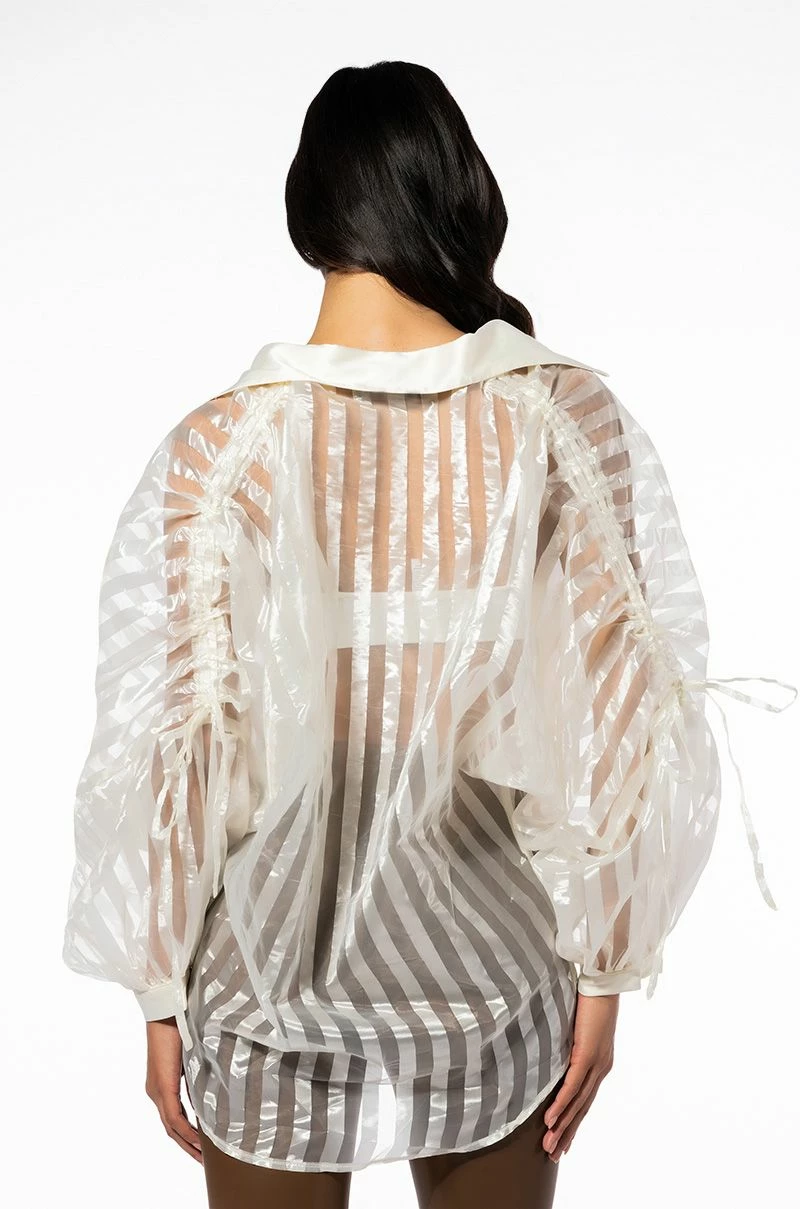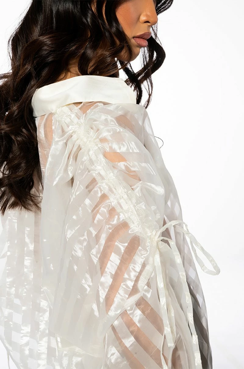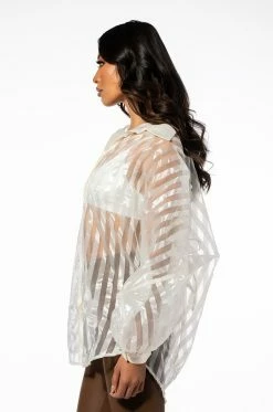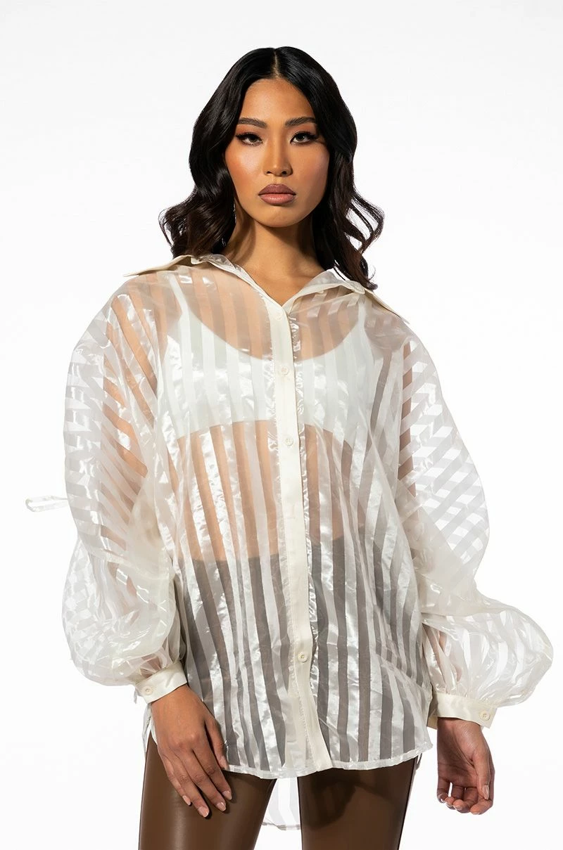 Working for the weekend just got a little chicer. The AKIRA Label Weekend Love Oversized Blouse features a sheer chiffon fabrication, a satin point collar, long puffed blouson sleeves, adjustable tie up ruched shoulder detailing, vertical stripe accents, an oversized silhouette, a button down front closure. Style atop a sleek bodysuit, distressed denim, and chunky booties for a complete look.
