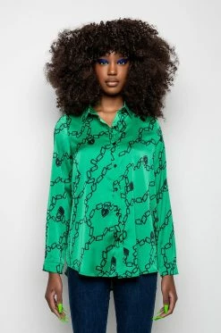 The AKIRA Label What’s New Button Up Blouse is made from a soft and shiny satin fabrication and is complete with a collared neckline, a chains, padlocks, and heart padlocks graphic print, a button up front closure, and long sleeves with button wrist details.