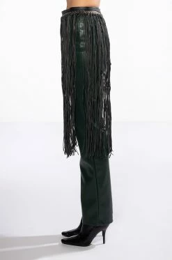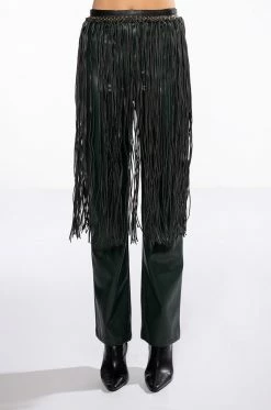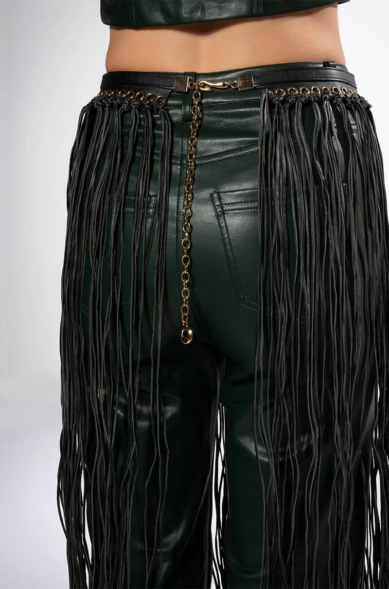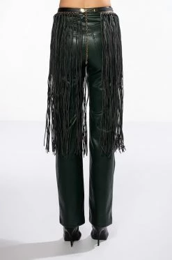The AKIRA Label Wyatt Western Fringe Belt is a faux leather accessory featuring a vegan leather base, coordinating vegan leather fringe, faux gold hardware, grommet detailing, and an extended chain link belt design. Complete with a hook closure. Style with a shirt dress and cowboy boots.