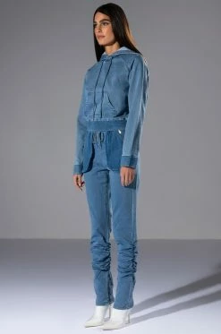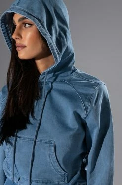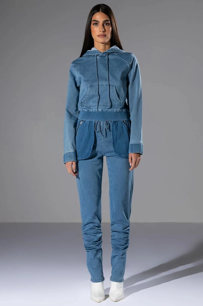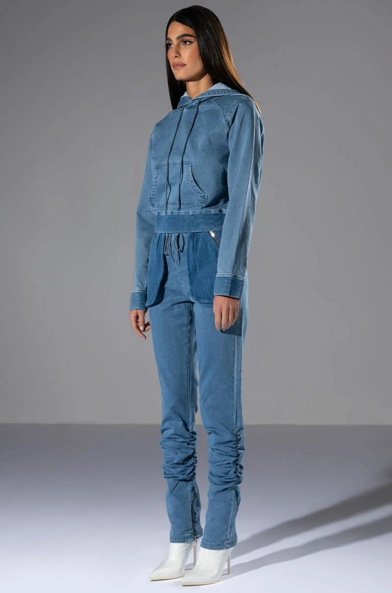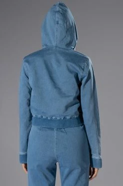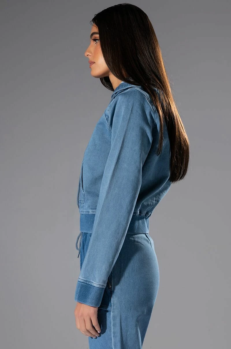 The AKIRA Label You Oughta Know Denim Hoodie is a cozy pullover featuring a denim base fabrication, an attached hood, a long sleeve design, and a slightly cropped cut. Complete with ribbed knit hems and a kangaroo front pocket. Style this with the coordinating The AKIRA Label You Oughta Know Denim Jogger and sneakers for an effortless look!