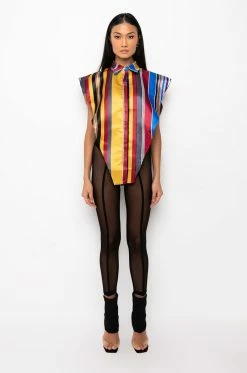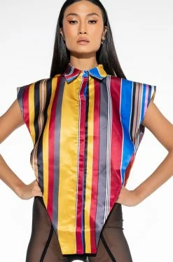 The AKIRA Label Your Muse Button Up Blouse features a sleeveless silhouette, wide shoulder details, button up front, an extended front detail, striped print pattern, and collared neckline.