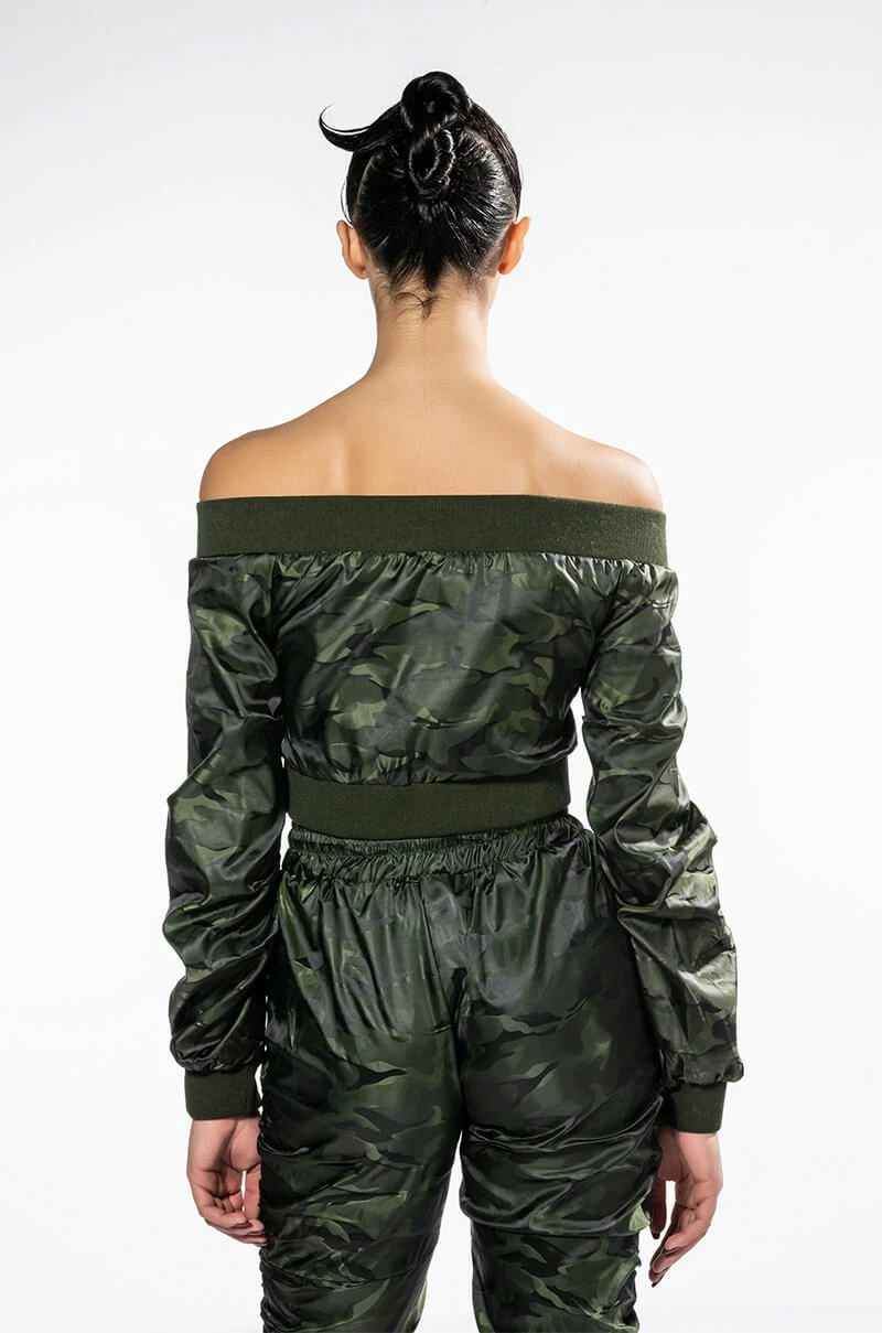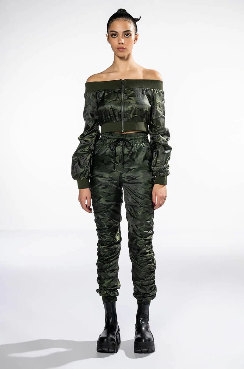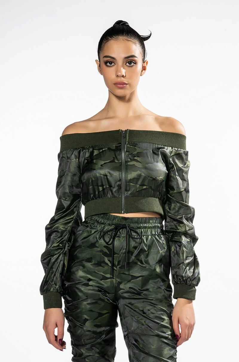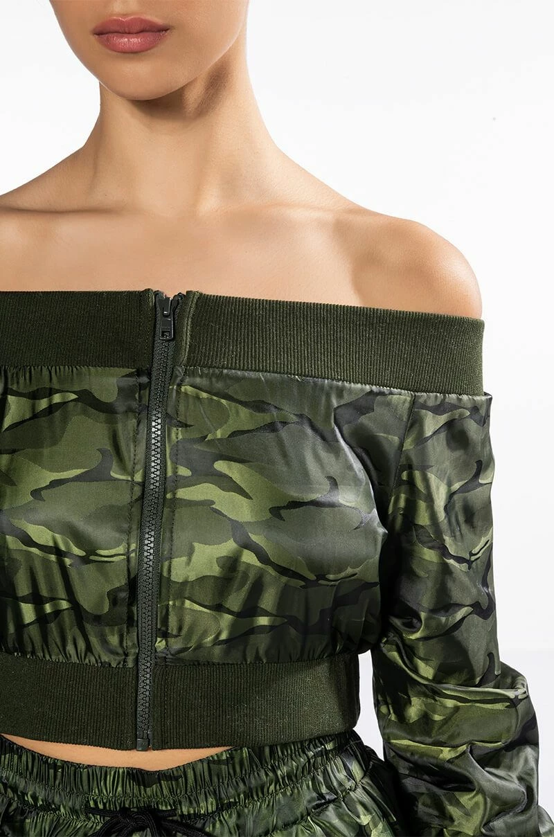The AKIRA Label Youre The Problem Zip Up Top features a sleek nylon fabrication, long sleeves, an off the shoulder silhouette, a cropped cut, and wide ribbed knit hems. Complete with a tonal zip front closure and camo print patterning. Pair with the coordinating AKIRA Label Youre The Problem Jogger for a complete look.