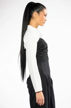 The AKIRA Label ZIPPIE DETAIL BLOUSE is a sleek and long sleeve collared top featuring a cropped flattering scrunchie design and zip front closure. Looking fierce and fashionable as alwaysss….